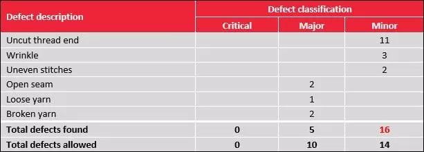 - Lỗi lớn: là những khuyết điểm có mức độ nghiêm trọng hơn nhiều so với lỗi nhỏ và có thể ảnh hưởng xấu đến hình thức, chức năng của sản phẩm. Khách hàng có thể dễ dàng nhận thấy những lỗi này và thường có xu hướng khiếu nại, trả lại hàng, hoặc yêu cầu bồi thường, đổi hàng mới. Mức dung sai (AQL) của dạng lỗi này sẽ thấp hơn so với lỗi nhỏ khi xử lý đánh giá và kiểm định.