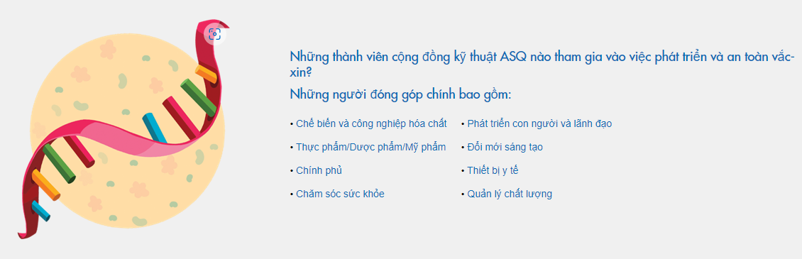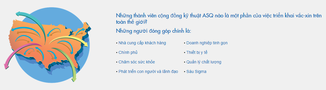 Nhấn mạnh dưới đây là từng giai đoạn ứng phó chính và cách thực hành tốt nhất về chất lượng đã áp dụng cho các quá trình đó. Các thành viên ASQ luôn chia sẻ mục tiêu giải quyết các vấn đề cải thiện – thúc đẩy cuộc sống và cộng đồng của chúng ta. Những nỗ lực này đang giúp đảm bảo rằng quá trình tiêm chủng an toàn mà khoa học hiện đại và đổi mới chất lượng có thể đảm bảo.